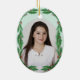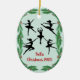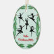 Ballerina, dancer ornament with name, year, and photo. Green pine borders on both sides of oval tree ornament. Five ballerina silhouettes are leaping and doing pirouettes. Add her name and year beneath the dancers in red script. Use the template on the back to upload a portrait of the dancer.