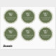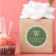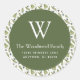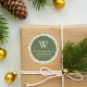 This festive Christmas return address sticker features an olive green circle on a watercolor pattern of winter greenery, including evergreen pine trees and holly sprigs with red berries, on a white background. Personalise the design with your monogram initial and family name in white serif font, with your address below in sans serif.