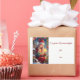 A friendly little girl with a small gift in her hand orders many greetings to the party.