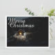 The card shows an atmospheric, wintry scene with a small, illuminated wooden hut in the middle of a snow-covered forest. The warm light source inside creates a beautiful contrast to the dark, peaceful surroundings. The elegant "Merry Christmas" lettering in white gives the motif a festive touch. 🎄✨