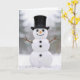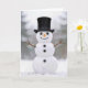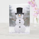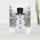 A cheerful snowman in a snowy landscape wears a stylish black top hat and has a bright carrot nose.