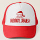 Red Christmas hat with Santa Clause saying Merry Xmas!. Funny gift idea for the Holidays. Also nice for Christmas in July summer party. Cute Holiday props and accessories for men women and kids. Custom headwear / sun protection cap.
