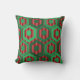 This throw pillow has a geometric design of hexagons in four shades of green on a field of stripes in two shades of red.