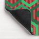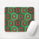 This mouse pad has a geometric design of hexagons in four shades of green on a field of stripes in two shades of red.