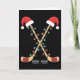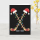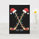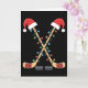 This Christmas card features two classic wooden hockey sticks crossed in an “X” shape against a deep black background. Each stick wears a bright red Santa hat, adding a fun holiday touch. Colorful Christmas lights are wrapped around the handles, giving the design a cheerful glow. The blades are decorated with red and black tartan tape for a cozy, winter look. Two hockey pucks sit below the sticks, tying the whole sports theme together. This design blends hockey spirit with holiday warmth, making it a great choice for any fan of the game.