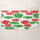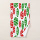This towel set has a repeating pattern of ovals in red and green with scattered white ovals all on a field of white.