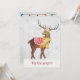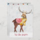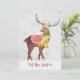 Big buck deer with winter scarf and red text on silver snowflake background.