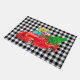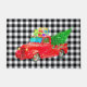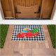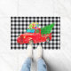 This Christmas holiday doormat is shown with a country style black and white gingham plaid print with a festive red truck art print.