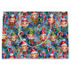 Unique Christmas pattern featuring elves and Christmas holiday decor on a blue background.