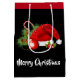 This Christmas holiday gift bag is shown in black with a red trim and a festive Santa hat art print.