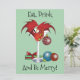 A cute red dragon in a martini glass holding a green olive. Ornaments, a Christmas present and green olives all around.