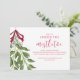 Mistletoe greenery cute and modern Holiday party theme. with white berries tied up in a red ribbon nestled atop a doorway awaiting those to stand underneath. This design features Christmas holiday party mistletoe, elegant greenery leaves foliage green, watercolor holly berry berries, whimsical simple minimalist minimal, trendy stylish calligraphy script text, whimsical typography font text, botanical festive red ribbon, Christmas holiday party invitations, a family friends celebration celebrate, Meet us under the mistletoe With scannable QR code and Facebook icon for your guests to easily access your Facebook events page.