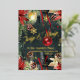 A festive, luxurious and elegant Christmas holiday gold foil party invitation featuring a dark green forest winter's night background with shimmery gold snowflakes, watercolor-painted poinsettias, pine cones, red berries with a warm lit lantern and a shining red ball ornament on red ribbon falling in mid-air. The front of the invite reads: Jingle & Mingle, At the Austin's Place, Saturday December 8th, 8:00 pm, while the back has your address and the necessary RSVP details. Only the front of the invite is in gold foil.
