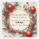 Pretty Christmas lable with red ornaments pine branches, red berries and gold glitter snowflakes.