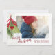 This design features a Christmas happy holidays greenery photo, with a one 1 single picture template, red and green holly berries, a winter greenery foliage botanical leaves, with pine tree branches branch berry, a watercolor red ribbon bow mistletoe, a lovely Christmas holiday photo cards, with a simple minimalist family photo, an elegant classic traditional Christmas, a stylish trendy calligraphy script