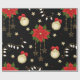 A roll of wrapping paper with a black background, decorated with a repeating pattern of Christmas-themed elements. The pattern includes red poinsettias with green leaves, golden Christmas ornaments adorned with red bows and snowflake designs, strings of lights with white bulbs, and golden stars of various sizes. Small red star-shaped dots are scattered throughout the background, adding to the festive look. The wrapping paper is partially unrolled, revealing the pattern and the rolled edge.