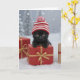 A cute little black cat wearing a stylish cap, resting his paws on a beautifully wrapped package. A charming and fun Christmas holiday card.