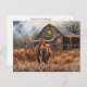 Longhorn cow with an ornament on his horn and a cute, decorated barn. A fun country western postcard.