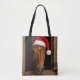 A horse wears a red Santa hat as it peeks out from a wooden stable, its warm tones beautifully contrasting with the festive colors