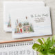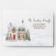 This design features a watercolor illustration of Christmas village house with snow and Santa Claus with presents.