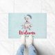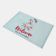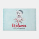 A welcome doormat with a whimsical and cute watercolor painting of a husky dog wearing a blue Santa hat.