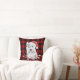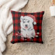 Husky dog with Christmas Santa Claus hat in snowflakes on red and black buffalo plaid.
