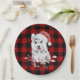 Husky dog with Christmas Santa Claus hat in snowflakes on red and black buffalo plaid.