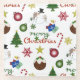 Christmas colourful surface pattern design with illustrations of a Christmas pudding, star, baubles, snowflakes, snowman, candy cane, Christmas tree, Christmas gift parcels and stocking.