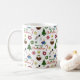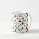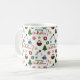 Christmas colourful surface pattern design with illustrations of a Christmas pudding, star, baubles, snowflakes, snowman, candy cane, Christmas tree, Christmas gift parcels and stocking.