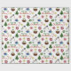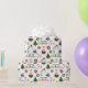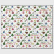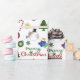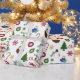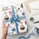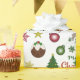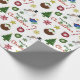 Christmas colourful surface pattern design with illustrations of a Christmas pudding, star, baubles, snowflakes, snowman, candy cane, Christmas tree, Christmas gift parcels and stocking.