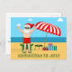 This cute Christmas in July postcard makes a perfect summer party invitation for a beach bash or pool gathering. Make it a fun north pole themed extravaganza with Santa Claus in his swimming trunks next to a red and white striped beach umbrella and gifts. I've never seen Mr. Klaus in a bathing suit before! The green text ties together the fun Xmas theme.
