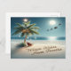 A serene design showcasing a tranquil beach scene with a lone palm tree decorated with ornaments and a star on top, with Santa's sleigh parked nearby and a message of "Warm Wishes from Paradise" written in the sand