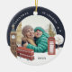 Celebrate a Christmas spent in London with this unique keepsake ornament. Design features a photo on each side, decorated with a hand illustrated Big Ben, double decker bus, and phone box. Personalise with the year.
