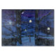 A winter night, looking over a gate flanked by two trees down into a snow-covered glen between rocky hills, filled with little farms and hedgerows and stone walls. A warm glow shines from many windows, Christmas lights sparkle on trees and fences, and a Christmas star beams from the roof of a manor house, all under the rays of a full moon.
