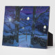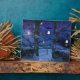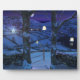 A winter night, looking over a gate flanked by two trees down into a snow-covered glen between rocky hills, filled with little farms and hedgerows and stone walls. A warm glow shines from many windows, Christmas lights sparkle on trees and fences, and a Christmas star beams from the roof of a manor house, all under the rays of a full moon.