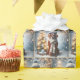 An Irish Setter dog wearing a winter hat and scarf sits beside a small, decorated Christmas tree surrounded by snow and festive lights