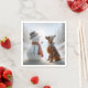 A snowman and an Irish Setter dog both wearing scarves share a moment of companionship in a snowy forest setting