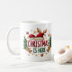 Festive 'Christmas is Here' mug design featuring cheerful lettering, Santa Claus, gingerbread, and holiday icons—perfect for sipping hot cocoa and spreading seasonal joy in 2024, 2025, and beyond! A delightful gift or personal keepsake for celebrating the holiday season.