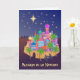 A joyful Christmas card with the greeting, Alegria de la Navidad ('Christmas Joy' in Spanish), with a starry sky, the three wise men on their camels in the distance, and Joseph, Mary and a donkey making their way into the brightly coloured little town of Bethlehem. The lettering, Christmas Joy, and stars are in gold-effect paint (not gold foil). A mixed-media design by Judy Adamson.