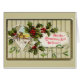 Sprigs of holly and mistletoe with berries, frame this old-fashioned winter scene. Greeting: May All ~ Christmas Joys Be Thine. Image of a Vintage Christmas Postcard on a custom grayish-yellow background.