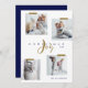 Celebrate the magical and festive holiday season with our custom holiday photo cards. Our modern, and minimalist design features a four photo collage scrapbook style layout with faux gold glitter tape placed over each photo to give the appearance that each photo is held in place with the stylish gold tape. "Christmas Joy" is displayed in a modern and trendy san serif and script typography combination in navy blue and faux gold glitter. Personalise with year and family name. The reverse side features a navy blue background with one of the taped photos repeated, along with personalised greeting and name. You can customise the text size, text colour, font and layout for your own personal design preference.