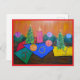This holiday post card displays a unique still life of various objects that reflect the joys of the Christmas season: candles, Christmas trees, pine needles, and ornaments.