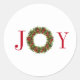 This small round sticker is shown with a festive Christmas wreath print spelled out in Joy.