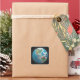 World globe with a white dove flying with red and white striped string with Christmas JOY text on a starry sky.