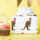 A drawing of a Christmas themed kangaroo wearing a Santa Claus hat and carrying presents in her pouch.