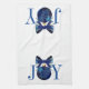 Shown on a White background, this kitchen towel has a blue ornament with a bow forming the "O" in the word JOY written in royal blue at both ends of this towel.