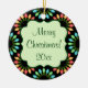 This festive holiday ornament design features circles made up of graphic Christmas light bulbs in colours of red, orange, green and blue.