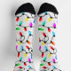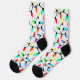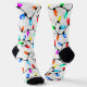 Colorful Christmas string lights with red, orange, yellow, light blue, pink, aqua, and green colors on a black cord in the snow. The retro lights my family used when I was a child inspired me to design this pattern. The snowy background is from an actual photograph. It's shown here on festive socks for women and men. Wear these fun Christmas lights socks anytime this holiday season!