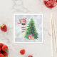 Paper napkins with a funny illustration. A cute llama wearing black sunglasses and a red santa hat. Standing behind a Christmas tree with festive presents. The word Joy written above his head in a colourful holiday font. Silver bokeh background. Whimsical and fun Christmas themed design.