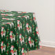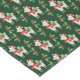 This tablecloth features a repeating Christmas design with a llama wearing a winter hat and scarf that is carrying presents on its back and holly leaves and red berries